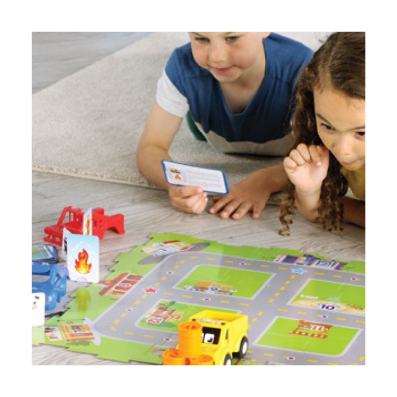 Dibuja una tarjeta de desafío de rescate de codificación, ajusta uno de los tres armazones de vehículos (coche de policía, camión de bomberos o vehículo de construcción) y codifica para resolver la misión.