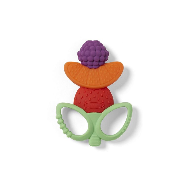 Este divertido mordedor de frutas de color es libre de BPA y se puede limpiar fácilmente con un paño.