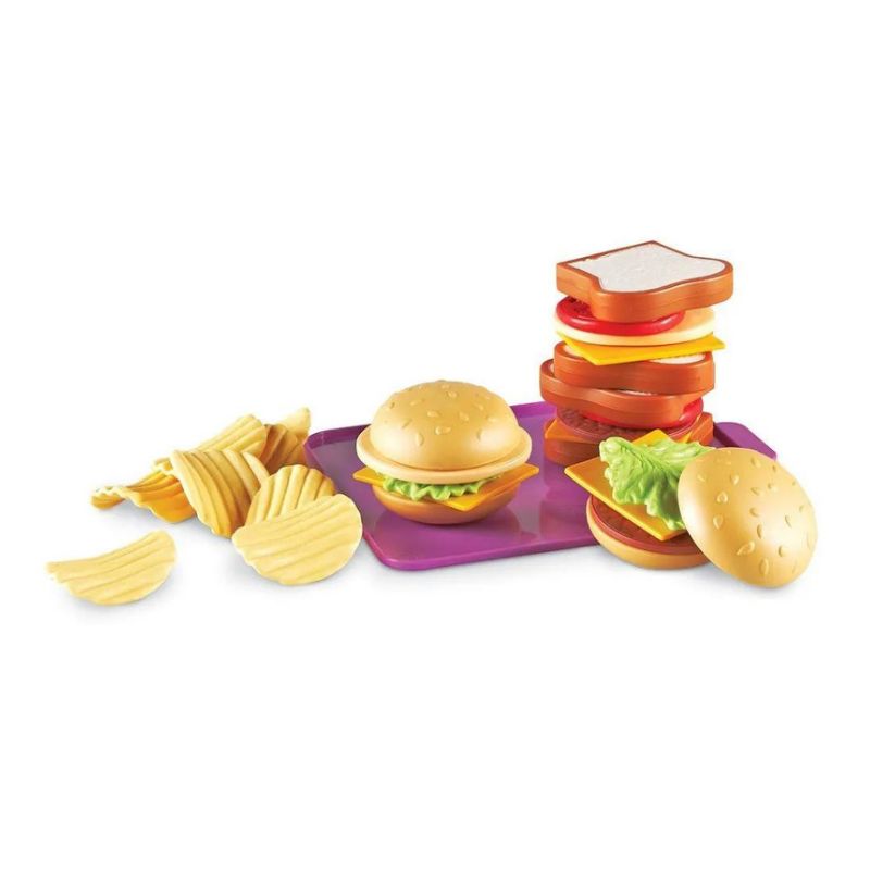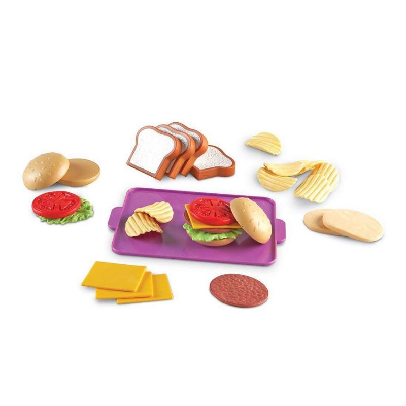 Contenido: Set de 29 piezas, entre ellas, 4 rebanadas de pan, 2 bollos (4 piezas), 2 rebanadas de pavo, 4 rebanadas de queso, 2 rebanadas de salami, 2 hojas de lechuga, 2 rebanadas de tomate, 8 papas fritas y una bandeja para servir.