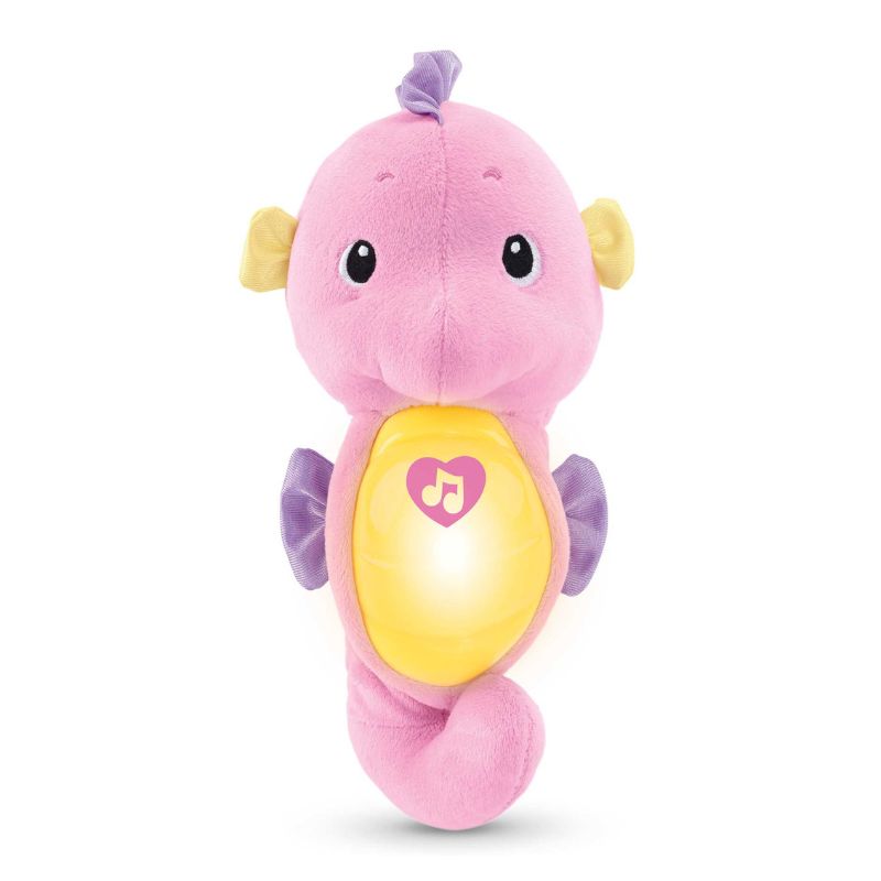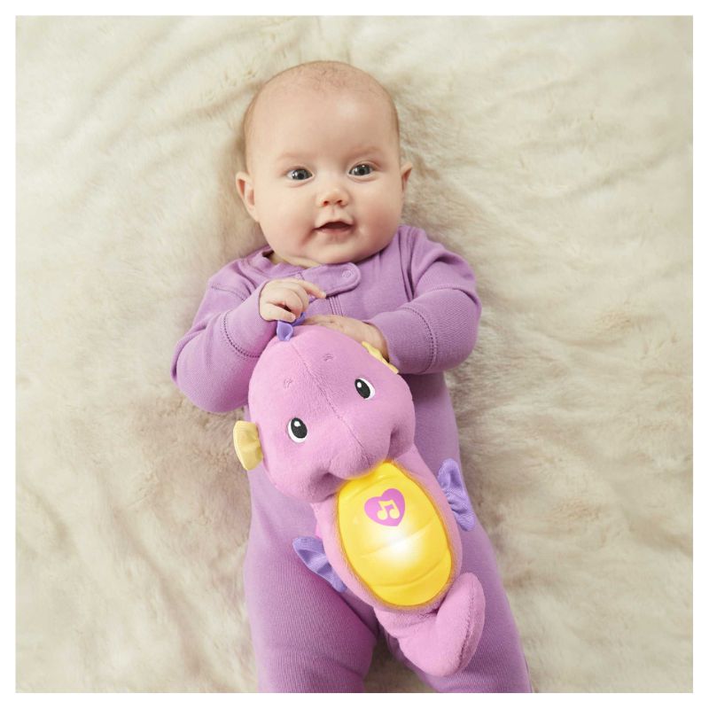 El juguete de peluche Fisher-Price Soothe & Glow Seahorse es un relajante compañero de abrazos para su bebé que se ilumina y brilla mientras suena una variedad de música reconfortante y sonidos del océano.