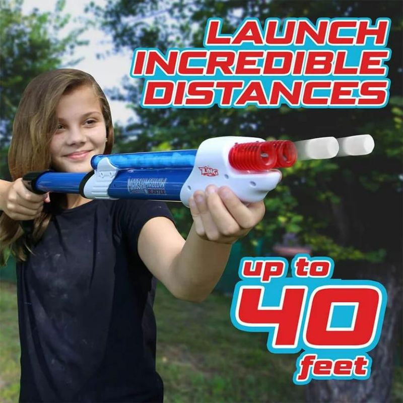 ¿Quién dice que no puedes jugar con la comida? Duplica los malvaviscos, duplica la diversión con este lanzador de doble cámara de munición que llegan hasta 40 pies de distancia.