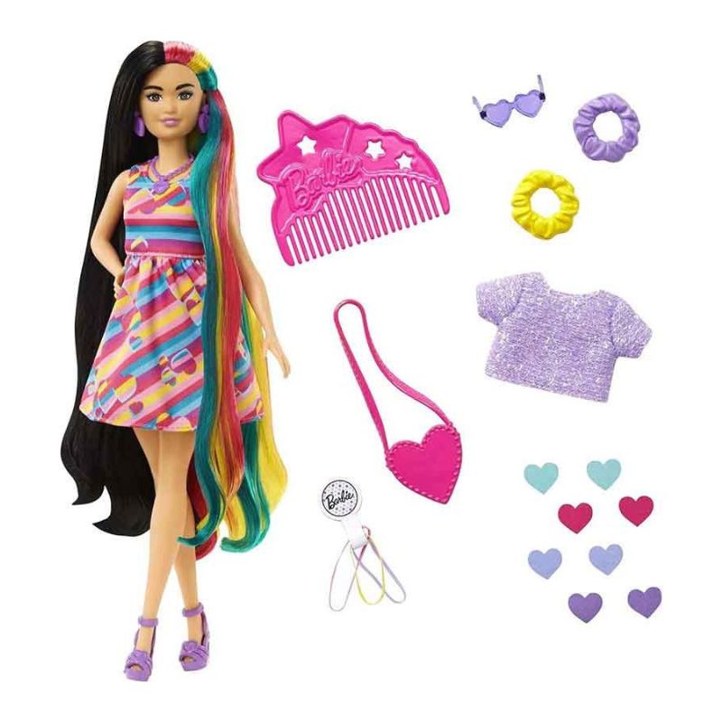 La muñeca Barbie Totally Hair con temática de corazones luce peinado, textura de pelo y look de moda propios y está inspirada en la muñeca Barbie que debutó hace 30 años.