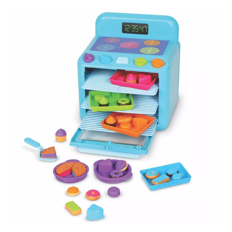 Los niños desarrollan habilidades de conteo, clasificación y reconocimiento de colores con este divertido mini horno con 30 pasteles, tartas, donas y más.