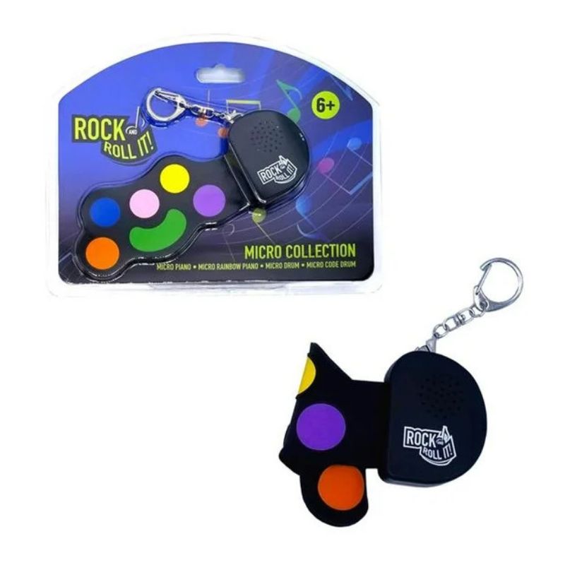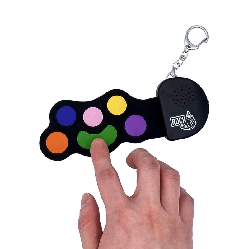 Activate con este mini pad de bateria de Rock and Roll de arcoíris y llavero con clip que los niños pueden colgar en la mochila y tocar donde quieran.